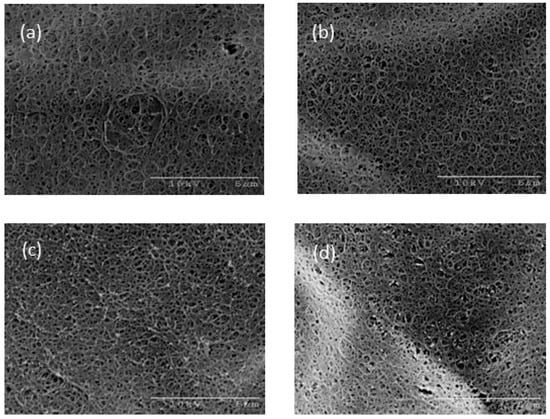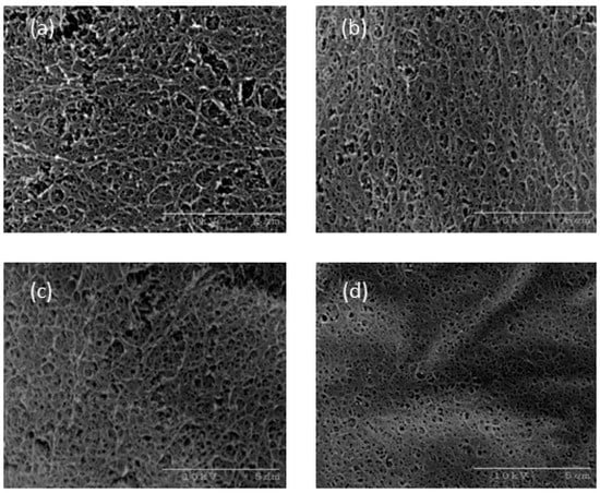 The syneresis of agarose gel is thought to be empirically controlled by sucrose addition. However, the mechanism of this phenomenon on the molecular level remains unclear. The improvements in the mechanical characteristics resulting from sucrose addition discussed in Section 2.3 are partly due to changes in the gel network. The moving speed of solvent molecules is thought to decrease intuitively owing to the mesh size of the gel network decreasing. However, the mesh size of the gel network, as observed by SEM (Figure 8 and Figure 9), was too large to prevent solvent transport. Furthermore, their size was estimated to range from 10 to 100 nm [10,11,12].