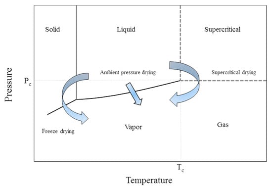 Phase diagram of a pure substance illustrating different drying routes. Adopted with permission from [10].