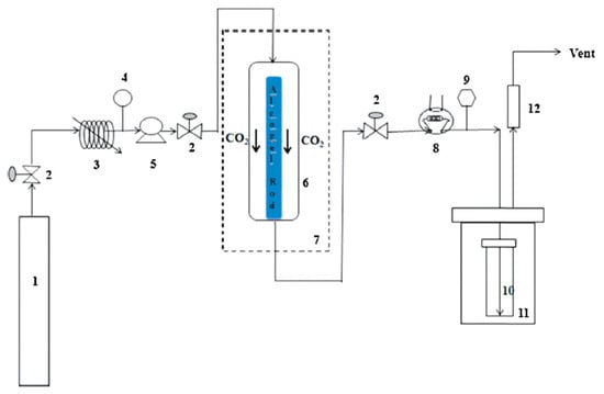 Schematic representation of process flow diagram of drying unit used in our studies (1. CO2 tank, 2. Valve, 3. Cooler, 4. Pressure transducer, 5. Pump, 6. Tubular extraction vessel, 7. Oven, 8. Micro-metering Valve, 9. Thermocouple, 10. Sample collection vial, 11. Dry ice cooling bath, 12. Rotameter). Adopted with permission from [5].