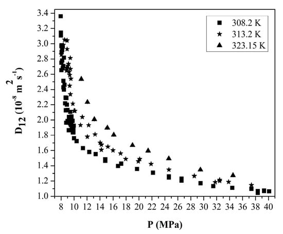 Binary diffusion coefficients of acetone in scCO2 at infinite dilution obtained by curve fitting in the time domain (FTD) method vs. pressure at three different temperatures. Adopted with permissions from [59,60].