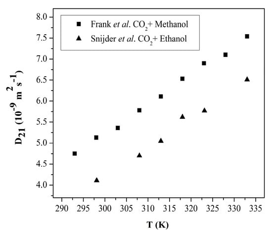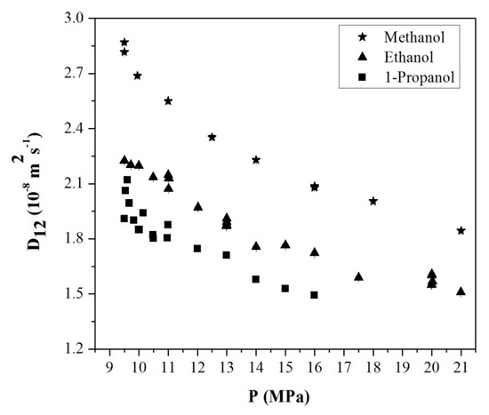 Kong et al. also measured the infinite dilution diffusion coefficients of a variety of polar compounds such as mono-alcohols and at 313.2 K at pressures higher than 9.5 MPa by using a technique called chromatographic impulse response (CIR) to diminish errors in the Taylor dispersion method [61]. In this technique, a polymer coated capillary tube is used as a diffusion column and a model is used to describe partitioning of a solute species between the polymer phase and supercritical phase. Measured binary diffusion coefficients of various organic solvents in scCO2 at infinite dilution at 313.15 K measured using CIR are given in Figure 9 [61].