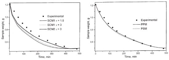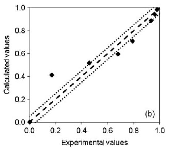 The binary diffusion coefficient is a function of CO2 mole fraction [46]. Composition dependence of binary diffusion coefficient of pore liquid and CO2 can be predicted using an empirical correlation given by Equation (6) which was proposed by Vignes et al. for concentrated liquid mixtures where is binary diffusion coefficient of CO2 in the pore liquid at infinite dilution and is binary diffusion coefficient of the pore liquid in scCO2 at infinite dilution, x1 is mole fraction of CO2, and α is a thermodynamic correction factor assumed to be 1 based on the ideal solution approximation for the binary solution in the pores [57]. It is generally agreed that Vignes expression gives excellent agreement with experimental results in the case of ideal solutions [57,58].
