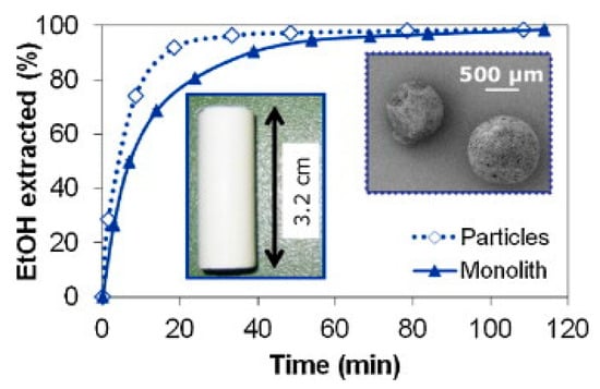 - García-González, C.A.; Camino-Rey, M.C.; Alnaief, M.; Zetzl, C.; Smirnova, I. Supercritical drying of aerogels using CO2: Effect of extraction time on the end material textural properties. J. Supercrit. Fluids 2012, 66, 297–306. [Google Scholar] [CrossRef]