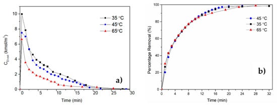 Ethanol exit concentration change (a) and percent removal (b) with time for different temperatures for supercritical drying of calcium alginate beads.