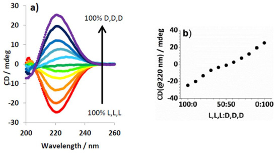 (a) CD spectra of mixtures of L,L,L and D,D,D (total concentration = 0.625 mM in), changing in 10% concentration increments in the presence of C8 (0.625 mM) from 100% LLL (red) to 100% LLL (purple); (b) Data extracted from graph (a) at 220 nm.