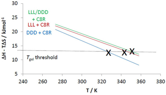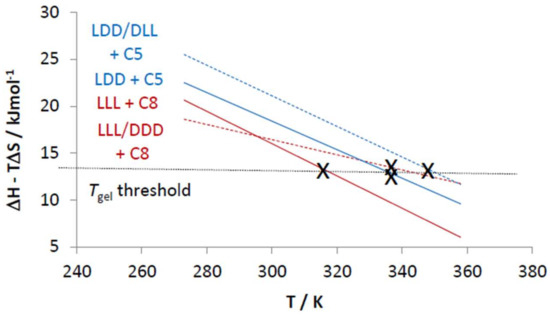 We then carried out a van ’t Hoff analysis of the VT-NMR data to yield ΔHdiss and ΔSdiss values for the gel–sol transition (Table 3). Firstly, it should be noted that for all cases, there is an enthalpy–entropy balance [87,88]—if gelation is enthalpically more favoured (i.e., stronger interactions between gelators), then the increased order associated with the better packed network of the gel network makes it less entropically favoured. It is actually the balance between ΔHdiss and ΔSdiss that determines how thermally stable the gel really is (ΔG = ΔH − TΔS). For L,L,L/D,D,D combined with C8, the racemic gel is more thermally stable because the gel has a much lower ΔSdiss value—i.e., the racemic gel is less entropically disfavoured, which more than compensates for it being less enthalpically favoured than the enantiopure gel. The lower enthalpy for gelation of the racemic mixture means less of the gelator is in the solid-like fibres at room temperature. However, the lower entropic cost of assembly for the racemic gel also means this racemic gel is less thermally sensitive (ΔG = ΔH − TΔS) and the racemic gel therefore survives to higher temperatures than its enantiopure analogue. This can be demonstrated by plotting ΔH − TΔS (i.e., ΔG) against temperature (Figure 4). The gradient of the line for the racemic mixture is much lower than that for the enantiopure system because of the lower entropy gain on conversion into a sol.