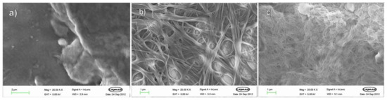 FEG-SEM images of xerogels formed by: (a) L,L,L and C8R; (b) D,D,D and C8R; (c) L,L,L + D,D,D and C8R.