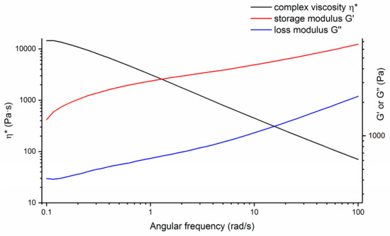 η*, because of this integration, is a good visible indicator of attributes such as the flexibility or stiffness of a material during formation. One more advantage of complex viscosity is that, when it is plotted as a function of angular frequency, it can be equated to a shear viscosity vs. shear rate profile for certain materials utilizing the Cox–Merz rule [18,19]. This process also provides a way of calculating the effective viscosity/shear rate profiles when it is hard to test effective viscosity from traditional methods. For the current system, hydrogel matrixes were tested, yielding the typical profiles as shown in Figure 2, which is a representative profile of a hydrogel matrix and G’ > G”, consistent with a matrix which behaves like an elastic solid [20]. No cross-over point between G’ and G” was observed, nor was there any region shift. The matrix behaved like a stable visco-elastic solid in the frequency range and exhibited behavior typical of soft gel or showed dispersion with a weak structure. Complex viscosity (η*) performance against frequency, therefore, was deemed important for studying the hydrogel’s rheological properties. Different hydrogel systems and process/composition variables were examined to bring about the complex viscosity changes; by monitoring η* performance, it is expected that the final product’s performance can be predicted without further fabrication.