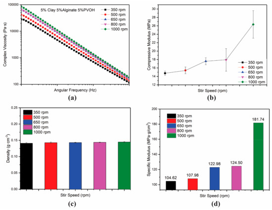 Processing rate (in this case stirring speed), which controls dispersion of the hydrogel components, was the first factor examined, as it might impact rheological properties. The hydrogel system used here was 5% ammonium alginate/5% clay/5% PVOH (Mw = 31 k). Ammonium alginate was selected to amplify the effect of viscosity due to the relative insensitivity of viscosity observed in the original clay–PVOH matrix system. Figure 3a shows that the hydrogel exhibited a general trend of increasing viscosity with stirring speed increase. Figure 3b shows that the modulus of aerogels behaves similarly to the stirring rate of hydrogel, and similarly increased as stirring speed increased. The viscosity of hydrogel stirred at 650 and 800 rpm performed similarly, which was also reflected simultaneously from a similar mechanical strength of the respective aerogel samples. All aerogels were produced from the same concentration and composition of the “alginate–clay–PVOH” matrix, which resulted in similar aerogel densities (see Figure 3c), and the specific modulus had the same performance as the overall modulus (see Figure 3d).
