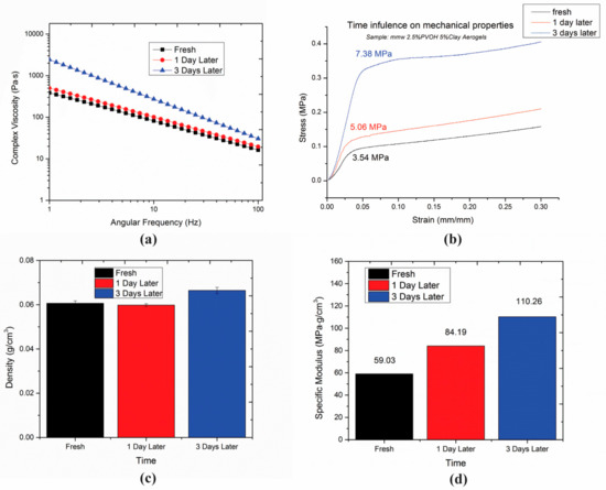 Related properties of hydrogels at various standing times. Viscosity (a), mechanical performance (b), different density (c), increasing trend of specific modulus (d).
