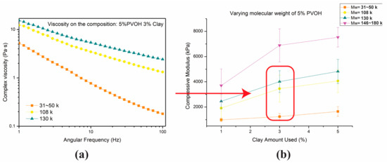 The molecular weight of PVOH used in this study is discussed in this section. The hydrogel system used for this comparison was 3% clay/5% PVOH (varied Mw). The viscosity of the hydrogel system can be tuned by changing the molecular weight of PVOH. Figure 7 shows that the viscosity increased as PVOH molecular weight increased, resulting in an aerogel modulus increase, similar to the conclusions of Lamison et al. [25]. From the view of viscosity, a higher Mw of PVOH means greater chances for local polymer chain entanglement. Even without the cooperation of clay, the preparation of PVOH solutions with different Mws can still bring about this phenomenon: as the molecular weight of PVOH increases, the respective PVOH solutions become more difficult to prepare.