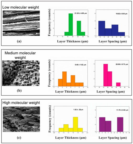 A series of SEM images as well as the layer thickness and spacing, exhibiting the influence of hydrogel viscosity based on different Mw values of PVOH. (a) Incorporated with low molecular weight (31–50 k) PVOH; (b) Incorporated with medium molecular weight (108 k) PVOH; and (c) Incorporated with high molecular weight (146–180 k) PVOH.