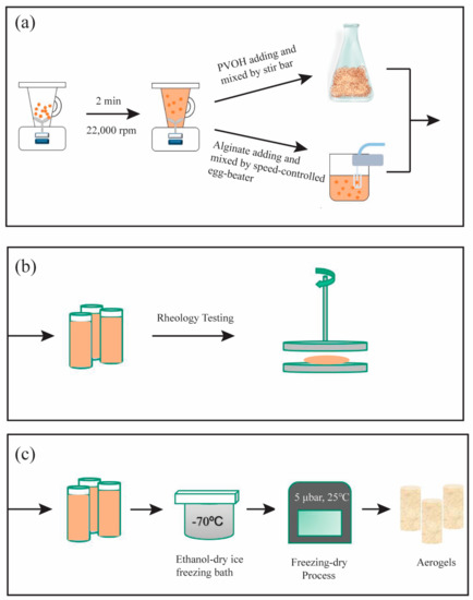 Illustration of aerogel fabrication and rheology test. Hydrogel preparation through high speed blender in order to ensure a good dispersion of clay suspension. And a gentle mixing with PVOH in order to avoid bubbles generated. Egg beater which can be controlled mixing rate was used to mix alginate(a); Once completed hydrogel preparation, specimen could be sent for a rheology test (b) or went through freeze-drying process to fabricated aerogels (c).