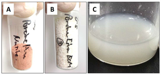 (A) Appearance of natural liver powder, (B) decellularized liver powder, and (C) L-ECM. Each powder type was obtained by the lyophilization of the corresponding liver tissue.