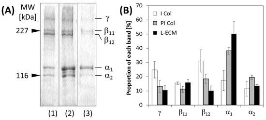 I (A) SDS-PAGE of each sample. (1) Solubilization with acid (I Col), (2) pepsin-acid solubilization (PI Col), and (3) L-ECM. The concentration of each solution was 0.75 mg/mL. (B) Ratios of detected bands in the all components (n = 3, bars represent standard deviation).