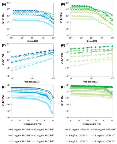 (A,C,E) Variations in G′ and G′′ at different concentrations of PI Col (3, 2, and 1 mg/mL), (B,D,F) L-ECM concentrations (10, 5, and 3 mg/mL). Corresponding variations of G′ and G′′ with (A,B) dynamic strain sweep (DSS) mode, (C,D) dynamic frequency sweep (DFS) mode, and (E,F) dynamic temperature ramp (DTR) mode measured by a rheometer (conditions for DSS: frequency 1 Hz, temperature 10 °C; conditions for DFS: strain 5%, temperature 10 °C; and conditions for DTR: frequency 1 Hz, and strain 5%). All samples were dissolved in an aqueous solution adjusted with HCl at pH = 3.0.