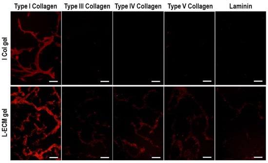 Fluorescent immunostaining images of I Col and L-ECM gel (scale bar = 50 µm).