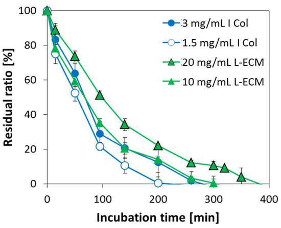 Degradation profiles of I Col gels (3 and 1.5 mg/mL) and L-ECM gels (20 and 10 mg/mL) using collagenase solution at a concentration of 0.05 mg/mL as a function of incubation time (n = 3, bars represent standard deviation).