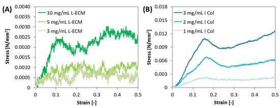 Average stress-strain responses (n = 3) of (A) L-ECM gel, and (B) I Col gel.