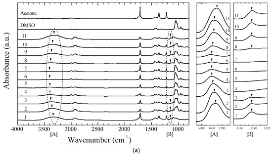 (a) ATR FT/IR spectra of a chemically crosslinked and dehydrated gel in various DMSO/acetone mixtures during the single-sample test shown in Figure 3. The detailed changes at around 3300 cm−1 (region [A]) and 1143 cm−1 (region [B]) are displayed; (b) The peak area at 1143 cm−1 normalized by the peak area at ca. 1427 cm−1, obtained by deconvoluting the spectra to remove the effects of other peaks. The respective number from 1 to 11 corresponds to those in Figure 3. The acetone concentrations are as follows; No. 1: 100, No. 2: 50, No. 3: 40, No. 4: 30, No. 5: 20, No. 6: 30, No. 7: 40, No. 8: 50, No. 9: 60, No. 10: 70, No. 11: 100 mol %.