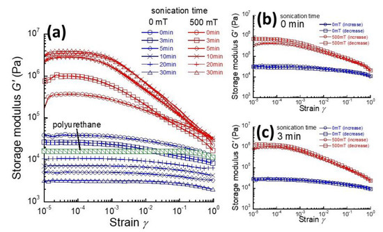 (a) Strain dependence of storage modulus for magnetic elastomers with various sonication times at 0 and 500 mT. Hysteresis in storage modulus for magnetic elastomers with sonication: irradiation time (b) 0 min and (c) 3 min.