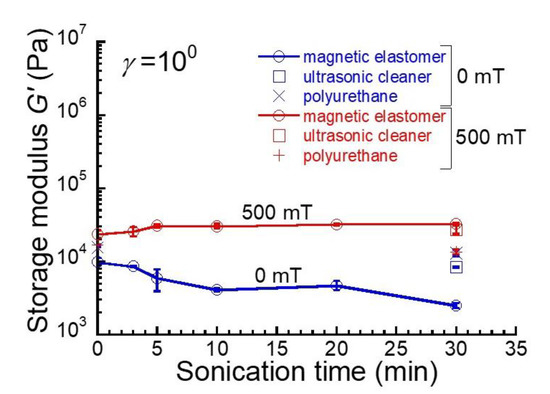 Figure 3 shows the relationship between the storage modulus for magnetic elastomers at γ = 1 and the irradiation time of sonication. The storage modulus for magnetic elastomers at 0 mT decreased with irradiation time. At 0 mT, the storage modulus for the magnetic elastomer that was sonicated by an ultrasonic cleaner for 30 min was almost the same as that without sonication. On the other hand, the storage modulus at 500 mT increased in the first 5 min, then remained stable at a constant value, suggesting that a relatively large number of chains occurred in large strains for magnetic elastomers that had been sonicated for longer than 5 min. In addition, there was no clear change in the storage modulus for magnetic elastomers with an ultrasonic cleaner and high-power sonication for 30 min. Similar to Figure 2, the storage modulus for polyurethane elastomers was not affected by the magnetic field, independently of the sonication time (4 plots of ×, + in Figure 3).