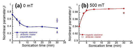 Figure 4a shows the relationship between nonlinear parameter β at 0 mT and the irradiation time of sonication for magnetic elastomers. The nonlinear parameter β was defined as the following equation [6,8],