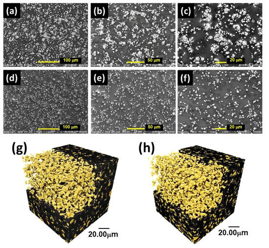 (a–f) SEM photographs and (g,h) computed tomography images for magnetic elastomers (a–c,g) without and (d–f,h) with sonication for 20 min.