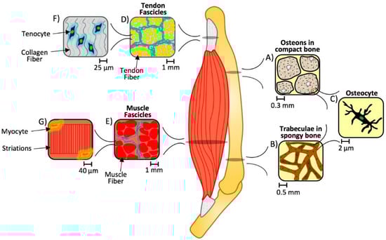 Multiscale hierarchical structure of bone, tendon, and muscle. An organ system consists of several organs with underlying hierarchical structures. In this case, bone (A–C), tendon (D,F), and muscle (E,G) units consist of unique cellular components (in the order of 2–40 µm) that are capable of sensing and modulating the tissue-level composite architecture at various length scales (from 0.3–1 mm, depending on the tissue) under physiological conditions. When these architectures are disturbed, the normal spatial and temporal responses of these tissues to their static and dynamic biomaterial environment is disrupted and contributes to eccentric loading and ultimately injury and pathological losses in structure and function [13,14,15,16,17,18].