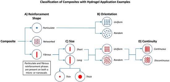 Hierarchical classification of composite hydrogels based on their reinforcing phases at micro and nanoscales. (A) Reinforcement shape may be particulate, fibrous, or a hybridization of the two [24,25,26,27,28]; (B) both particulate and fibrous reinforcement has either uniform or random orientations [29]; (C) fibers in a reinforcing phase can be classified as long or short and further organized based upon fiber diameters or thicknesses; (D) within a composite, fibers may have continuous or discontinuous patterns [8].