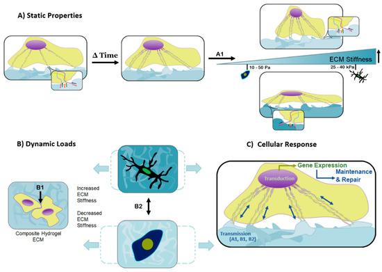 Cellular behavior is affected by a multitude of studied contributions, including mechanical cues, static properties, and dynamic loads. (A) Responses to the substrates mechanically static properties are controllable by the matrix stiffness and topographical features, equally capable of dictating cell motility, proliferation, and differentiation. Over time, the cell assesses its local environment and improves focal adhesion sites on suitable substrates through the development of its cytoskeleton. The overall stiffness of the matrix determines the coupled forces created by the probing cell and matrix response, represented by A1. The softer the matrix, the more the cell is able to overcome the matrix stiffness and become rounder as the cytoskeleton pulls inward. In contrast, a matrix of increased stiffness causes the cell to spread over the matrix as the cell’s cytoskeleton is unable to pull inward; (B) dynamic forces must appropriately be transferred through the composite substrate for healthy cellular function and ultimately normal tissue- and organ-level turnover. The amplitude and frequency of the dynamic loads, paired with the stiffness of the matrix, determine the maximum deformation of the matrix, represented by B2; (C) combining the signals the cell detects from the matrix stiffness, A1, the external dynamic forces, B2, and intercellular contact forces, B1, results in a coordinated transmission, and subsequent transduction (gene expression) that leads to tissue maintenance and repair. These tailorable components are responsible for cellular behavior and can be used in the design of composite hydrogels to create material systems targeted toward diverse cell types and tissues.
