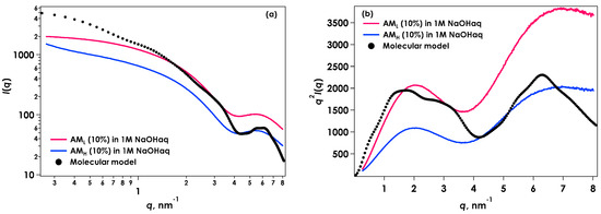 (a) Small-angle X-ray scattering (SAXS) from AML and AMH in 1 M NaOH aq. The scattering curve calculated from the molecular model is also shown; (b) Kratky plots [q2I(q) vs. q] for SAXS data.