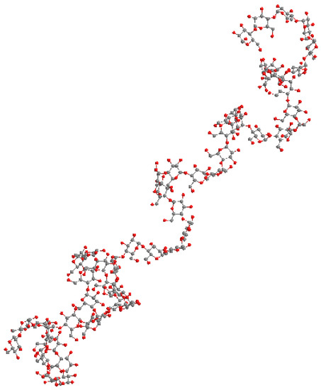 Figure 3 shows the molecular model of amylose chain (degree of polymerization = 50) conformation simulated using a Monte Carlo method as considering energy map of maltose conformation. Monte Carlo amylosic chains were generated to be distributed consistent with the potential energy of nonbonded nearest-neighbor interactions [4,5,6]. Amylose in the solution state can adopt a helical structure, even with molecular motion. The scattering curve shown in Figure 2 was calculated from this molecular model using the Debye formula [7] by assuming that each atom was sphere with van der Waals radius [8]. Two maxima were present in the Kratky plot, similar to that seen in the experimental data, suggesting that this behavior was characteristic of the helical structure. It is confirmed that the calculated curve can explain experimental data qualitatively. Their deviation may be due to the shortness of model chain and the calculation from only one simulated molecular model. Bayer et al. [9] evaluate that the statistical chain segment of amylose is one turn of the helix. This estimation is correlated with the present molecular model and SAXS results, suggesting partially helical conformation.