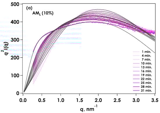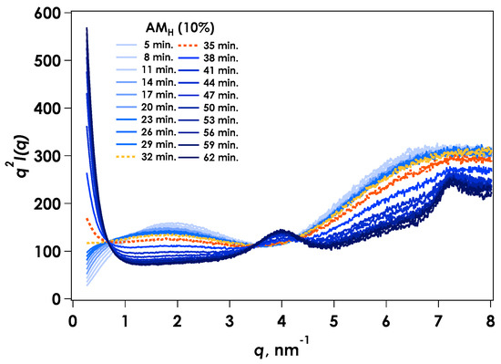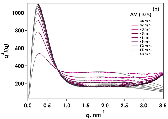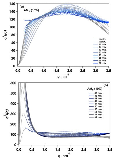 Figure 6 shows the Kratky plots for tr-SAXS obtained during monitoring of the gelation of AMH by in situ neutralization. Compared with the AML system, the AMH system contained a steeper slope increase in the smaller angle region, indicating greater aggregation. However, it appeared to have a trend similar to that of the AML system. Thus, the experimental results can be provided by the scattering function, including the Debye-Bueche model for the aggregated component, as:
