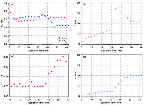Figure 8 shows the time course for each parameter evaluated by curve fitting with Equations (1) and (2). Figure 8a represents the time variation in Rc. The value of Rc changed only slightly with reaction time, and was nearly constant at about 0.6 nm, corresponding to the radius of a single amylose chain. This result suggests the existence of dissolved amylose chains in the overall reaction process. The Ξ and x values were included in the exponential function of the aggregated component in the AML system. The value of Ξ, corresponding to the aggregation size, was several nm initially, then increased dramatically to about 17 nm at the gelation point, which occurred through formation of a cross-linking zone with aggregation and crystallization of amylose chains. The value of Ξ tended to decrease after gelation. The exponent x increased from 0.70 to about 0.85 after gelation. When the value of x was 2, a Guinier-type region was indicated, with a Gaussian density distribution. Thus, the aggregation structure had a wider size distribution immediately after gelation, then the aggregation restructured. In contrast, an AMH system was analyzed using a Debye-Bueche-type function to evaluate a value, which was several nm and increased to about 10 nm after gelation. After 50 min, fitting was performed while maintaining an Rc value of 0.45 nm to avoid the effect of the other component.