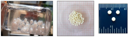 Spherical polyurea (PUA) aerogel beads during solvent exchange with acetone (left) and after dried with supercritical fluid (SCF) CO2 (middle and right).