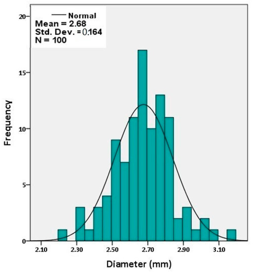 Size distribution of spherical PUA aerogel beads (calculated using IBM SPSS Statistics 24). Sample size: 100 beads.
