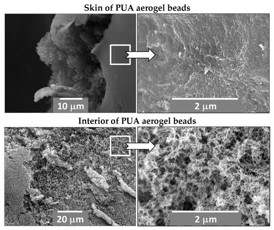 Scanning electron microscopy (SEM) images of spherical PUA aerogel beads at different magnifications: skin (top row) and interior (bottom row).