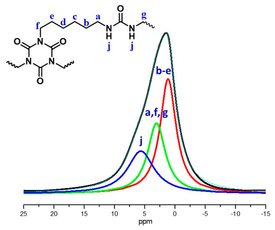 1H magic angle spinning (MAS) NMR spectrum of spherical PUA aerogel beads. Experimental spectrum (black line), fitted peaks (blue, green and red lines) and total fit (cyan line).