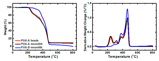 Thermogravimetric analysis of spherical PUA aerogel beads, as well as the corresponding monolith (PUA-A) and the monolith synthesized from the reaction of Desmodur N3300 with water (PUA-B), was carried out under N2 (Figure 8; Table 2). In all cases, decomposition took place in more than one step, indicating a complex mechanism, and the final residue was negligible. Both PUA-A and PUA-B materials showed two major decomposition events at 381–382 °C and 463–466 °C. PUA-A materials showed two more peaks at lower temperatures, i.e., 238–247 °C and 320–321 °C, which are attributed to degradation of the additional features of PUA-A vs. PUA-B, namely the urea bonds towards ethylenediamine.