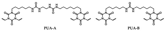 Structure of PUA obtained from the reaction of Desmodur N3300 and ethylenediamine in propylene carbonate (PUA-A) and from the reaction of Desmodur N3300 and water (PUA-B).