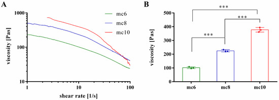 Rheological investigations on shear thinning behavior of mc6, mc8, and mc10 support bioinks. (A) Representative viscosity measurements at increasing shear rates; (B) Viscosity at a shear rate of 10 s−1 (mean ± SD, *** p < 0.001, n = 3).