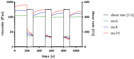 Furthermore, the shear recovery of the support inks was tested, following the proposed protocols of Paxton and co-workers and Kesti and co-workers [13,28]. Therefore, firstly a low shear rate of 5 s−1 was applied for 200 s, followed by a hundred-fold higher shear rate of 500 s−1 for 100 s. This procedure was repeated two times. Representative curves are shown in Figure 2. All three tested inks, mc6, mc8, and mc10, respectively, showed a shear recovery behavior over time. The first low-shear phase displayed higher viscosities of the inks compared to the three following low-shear phases, indicating an initial and not reversible breakage of inner polymer structures after a high shear rate was applied to the pastes. However, the viscosity progress of the pastes at the second, third and fourth low shear region was similar, showing full recovery to the previous state without further significant molecular changes of the polymers after the first high shear rate was applied.