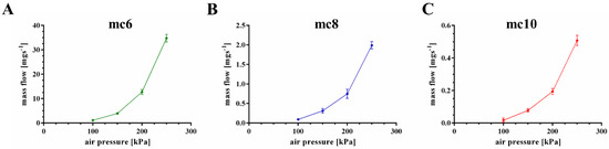 The extrusion properties were tested using a cylindrical needle with an inner diameter of 250 μm. Firstly, mass flow through the needle was evaluated as function of the applied air pressure (Figure 3). All three pastes showed increased mass flow with increased air pressure, but a significant (p < 0.001) higher mass flow of the mc6 paste was observed in comparison to mc8 and mc10. For example, at an air pressure of 200 kPa the mass flow of the mc6 paste was 12.72 ± 1.0 mg·s−1, whereas the mass flows of mc8 and mc10 were calculated as 0.75 ± 0.12 and 0.19 ± 0.02 mg·s−1. Based on these results, the following air pressure values were set for good extrusion with a plotting speed of 10 mm·s−1: mc6—100 kPa, mc8—200 kPa, and mc10—250 kPa.