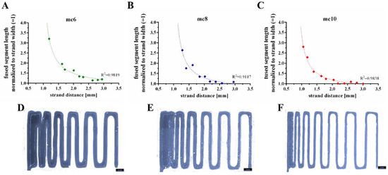 Shape fidelity of the mc inks was evaluated by a filament fusion test, as proposed by Ribeiro and co-workers [29]. Shortly, three layers of the tested ink are plotted on top of each other. The layers are plotted as meanders and the strand distances increase continuously (Figure 4). By comparison of the fused segment length at the meanders to the strand width, the shape fidelity can be evaluated (the quotient should be near to 1.0). The resulting quotients of the filament fusion test are shown in Figure 4A–C as a function of the strand distance. For all pastes the shape fidelity was increased at higher strand distances. In comparison to the mc6 and mc8 biomaterial inks, mc10 displayed the smallest ratios at every strand distance, indicating higher shape fidelity. The measured strand widths of mc6, mc8, and mc10 were 1.20 ± 0.15 mm, 0.75 ± 0.05 mm, and 0.62 ± 0.04 mm, respectively; the differences between the strand widths are clearly visible in Figure 4D–F. This indicates collapses of the inks in z-direction with smallest collapse of the mc10 paste.