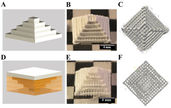 3D plotting of a Mayan pyramid with and without support structure. Principles (A,D) show the calcium phosphate cement (CPC) in white and mc in yellow. The upright and the inverted pyramids (B,C & E,F) revealed no changes of the inner structures, but at the borders.