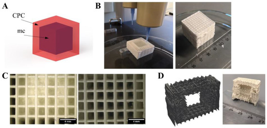 Firstly, the shape fidelity of CPC constructs with overhangs was compared to structures of the same geometry, which were plotted without supporting material. The setup of the plotting process is shown in Figure 5A. A Mayan pyramid with macropores, consisting of CPC was plotted from the large bottom to the small top with a 610 μm needle. The layer structure was clearly visible (Figure 5B), macropores between the CPC strands were stable after setting and clearly visible in μCT (Figure 5C). The macroporosity calculated from micro computed tomography data was 69.6%.