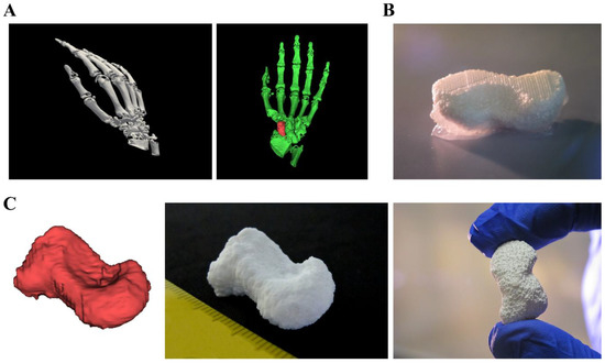 Fabrication of a scaphoid bone from clinical CT data. (A) 3D rendered human right hand and selection of the scaphoid by usage of 3D rendering software. (B) 3D multichannel plotting of the scaphoid bone consisting of CPC with mc10 as support ink. (C) Comparison of the stl-file and the real plotted structure with the characteristic shape of the human scaphoid.