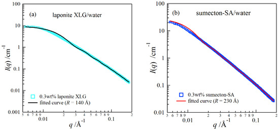 where J1 is the Bessel function of the first order, and β represents the angle between q and the axis of the disk. Figure 1 depicts SAXS curves for dilute clay aqueous solutions, (a) a 0.3 wt % laponite solution and (b) a 0.3 wt % sumecton solution. The curves fitted with Equation (2) are in good agreement with the scattering data. The fitting analysis showed that the size of sumecton (R = 23 nm) was larger than that of laponite (R = 14 nm).