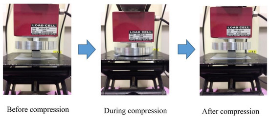 Pictures of 10 wt % sumecton/PAAS blend hydrogel in compression measurements before, during, and after uniaxial compression.